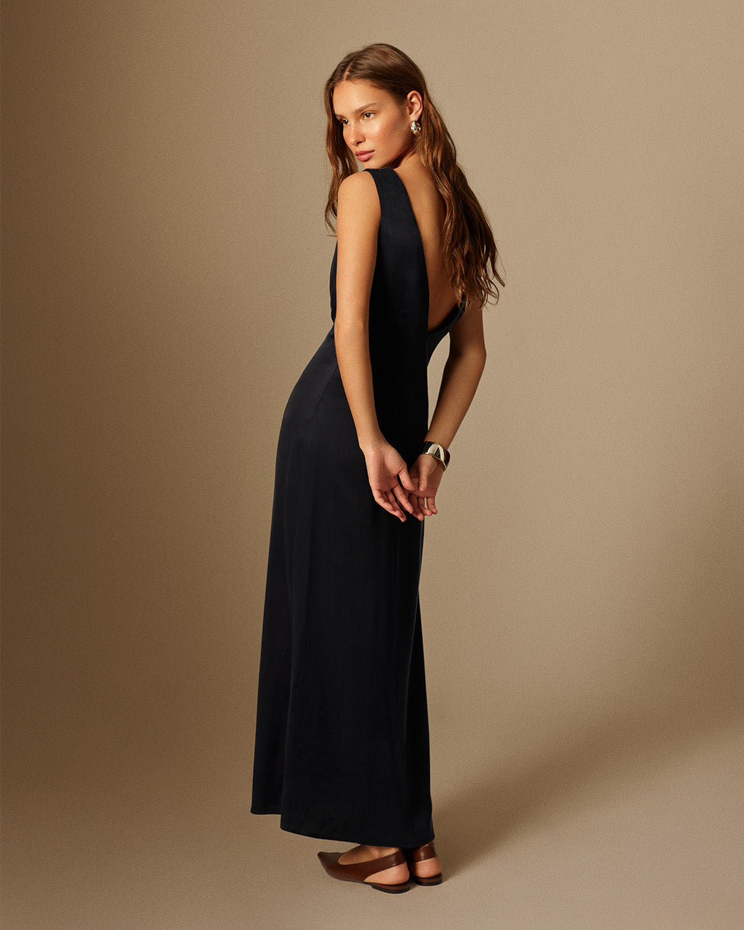 Indulge in luxury with our midnight blue maxi dress. Featuring an elegant open back and a V-neckline, this semi-fit dress is accentuated by a handcrafted rice pearl brooch detail on the chest. Designed with sustainable vegan fabric for breathable comfort, this serene and elegant design is reminiscent of the night, and it is made from sustainable vegan fabric.