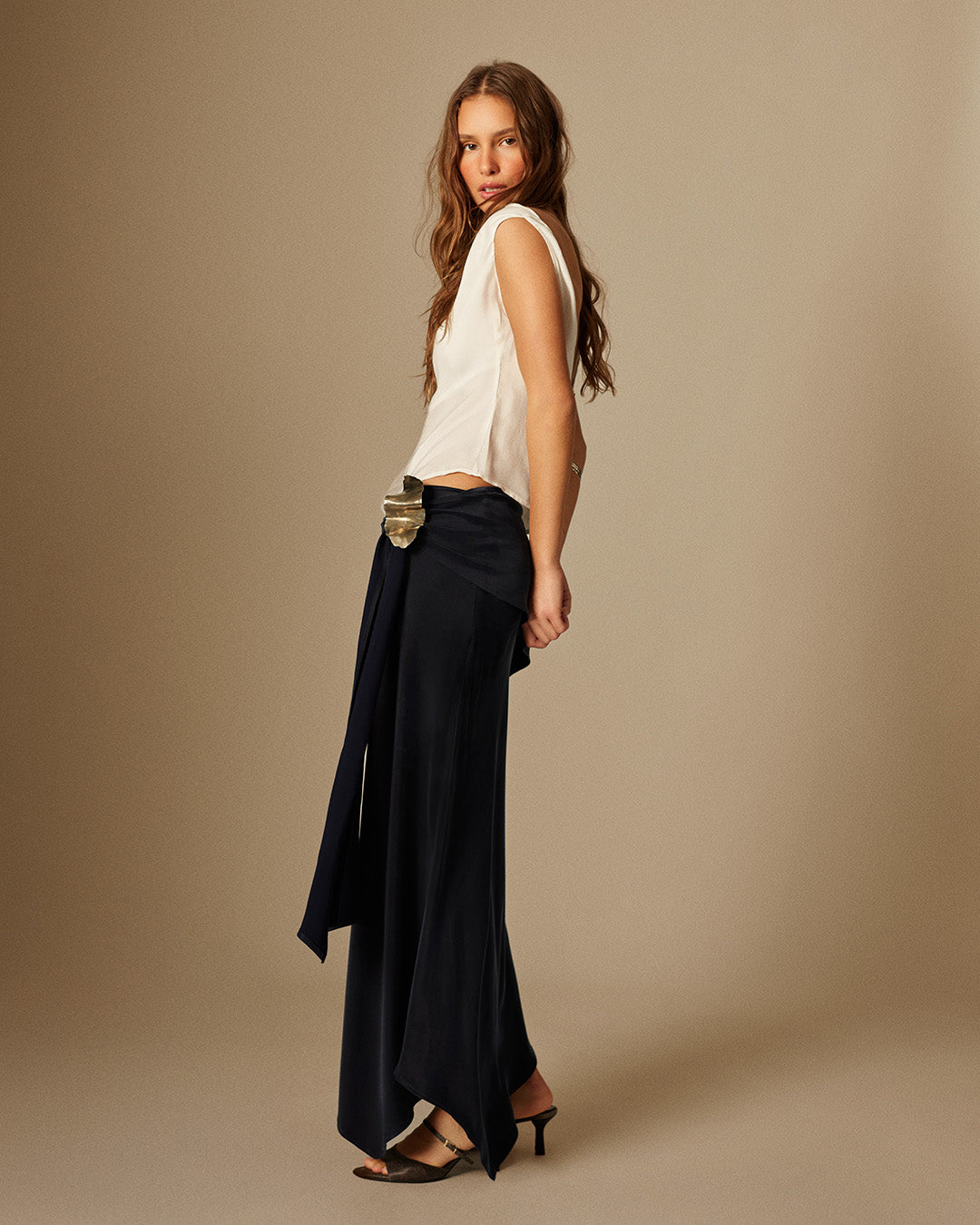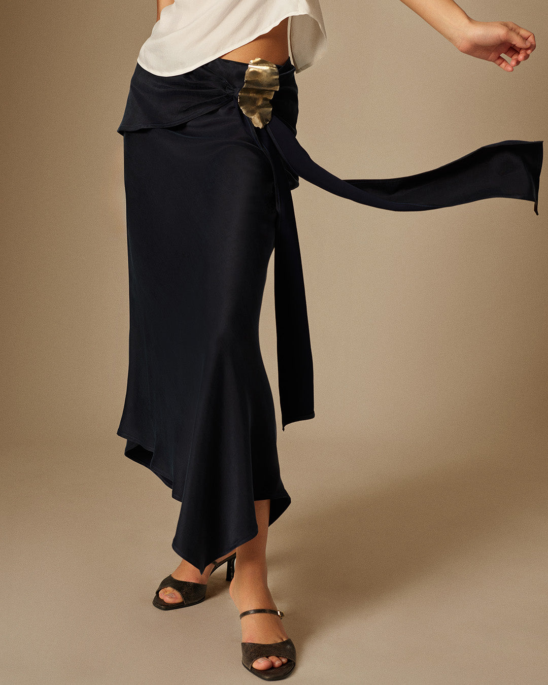 The midi-length asymmetric skirt completes your elegance with its waist tie and handmade asymmetric brass accessory. Crafted from vegan, lightweight, and breathable fabric, it’s perfect for both day and night wear. With its versatile style, it adds a refined touch to every moment, reflecting your unique sophistication.