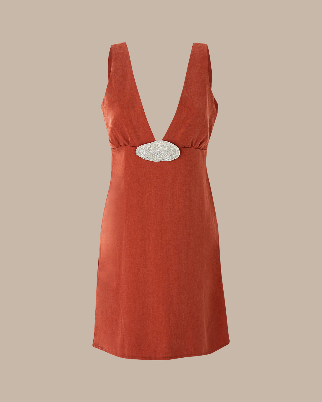 Indulge in effortless elegance with our burnt orange mini dress. Featuring a V-neckline and a flattering regular fit silhouette, this dress is detailed with a handcrafted rice pearl brooch on the chest. Made from sustainable vegan fabric, it offers breathable comfort and a timeless style.